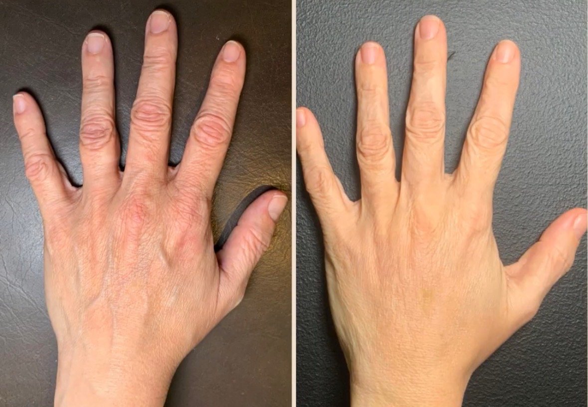 This client is in her early 50s and showed signs of aging on the top of her hands (“veiny” thinned skin). With 2 rounds of Radiesse we were able to stimulate collagen effectively adding volume to her hands and giving them a nice youthful boost.